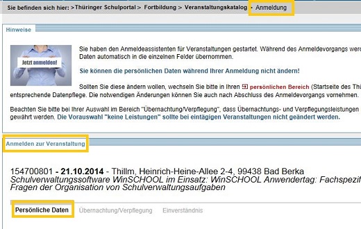 In diesem ersten Assistentenschritt werden Ihre persönlichen Daten aus den Stammdaten für die Anmeldung an der konkreten Veranstaltung übernommen und angezeigt. Eine Änderung Ihrer persönlichen Daten an dieser Stelle ist nicht möglich. Falls Sie feststellen, dass die in den Stammdaten hinterlegten Informationen teilweise nicht mehr aktuell sind, können Sie den Assistenten zur Anmeldung an einer Veranstaltung trotzdem vollständig durchlaufen. Nach Abschluss Ihrer Anmeldung wechseln Sie in den  persönlichen Bereich und passen Ihre Daten an.