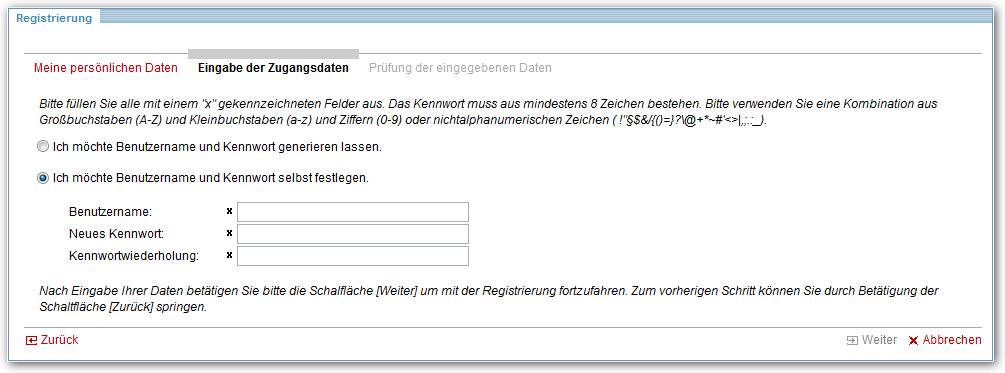 In diesem Fall werden Benutzername und Kennwort nach internen Richtlinien automatisch erzeugt und nach erfolgreicher Registrierung an die von Ihnen hinterlegte E-Mail-Adresse gesendet. Mit dem Funktionslink Weiter können Sie in die nächste Registerkarte wechseln. -