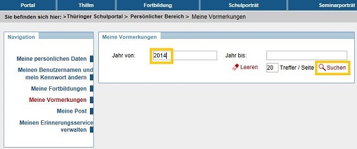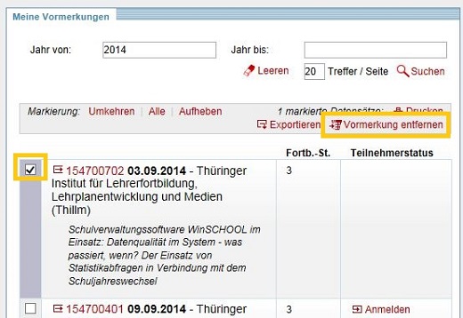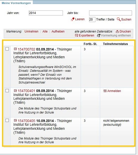 Für eine gezielte Suche ist es möglich, den Zeitraum für die vorgemerkten Veranstaltungen einzuschränken. Nach dem Betätigen des Links SUCHEN erscheinen alle vorgemerkten Fortbildungen in der Trefferliste, auf die die gewählten Suchkriterien zutreffen.