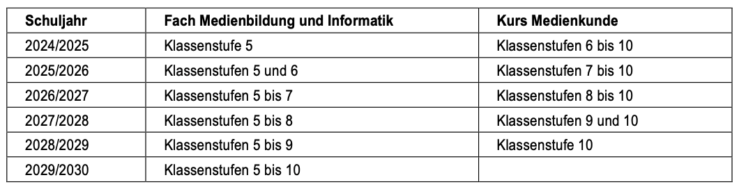 Aufbauend auf den Primarbereich wird der Erwerb von Medienkompetenz ab der Sekundarstufe I weiter fortgesetzt, wobei der bisher angebotene integrativ an ein Fach der Stundentafel angebundene Kurs Medienkunde beginnend ab dem 1. August 2024 schrittweise wie folgt durch das in den Stundentafeln der Thüringer Schulordnung aufgenommene Fach Medienbildung und Informatik ersetzt wird.