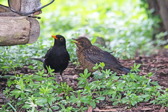 Das Foto hehört zur Serie "Amseln". Es zeigt ein Amselmännchen mit einem Jungvogel. Die Männchen sind schwarz gefärbt und haben einen gelben Schnabel, das Gefieder der Weibchen ist größtenteils dunkelbraun. Es gelten die Nutzungsbedingungen der Mediothek und Pixiothek.
