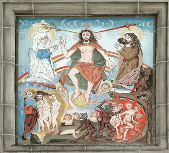 Das Fresko "Weltgericht" entstand um 1500 nach einer Vorlage der Schedel'schen Weltchronik (Nürnberg 1493). Der unbekannte Maler stammt aus der Werkstatt von Friedrich Herlin. Es befindet sich an einem Gebäude in der Nördlinger Pfarrgasse 3, dessen Kernbau um 1485 errichte wurde und als Kapelle diente. Das Bild ist unter CC0 lizenziert und kann somit frei verwendet werden.