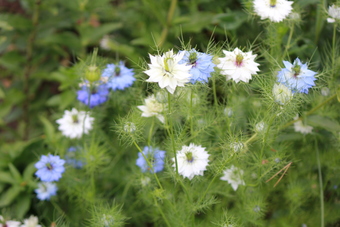 Das Foto zeigt Blüten der Jungfer im Grünen (Nigella damascena). Diese einjährige Pflanze aus der Familie der Hahnenfußgewächse kommt aus dem Mittelmeerraum und ist eine in Mitteleuropa häufig kultivierte Gartenpflanze. Das Bild ist unter CC0 lizenziert und kann somit frei verwendet werden.