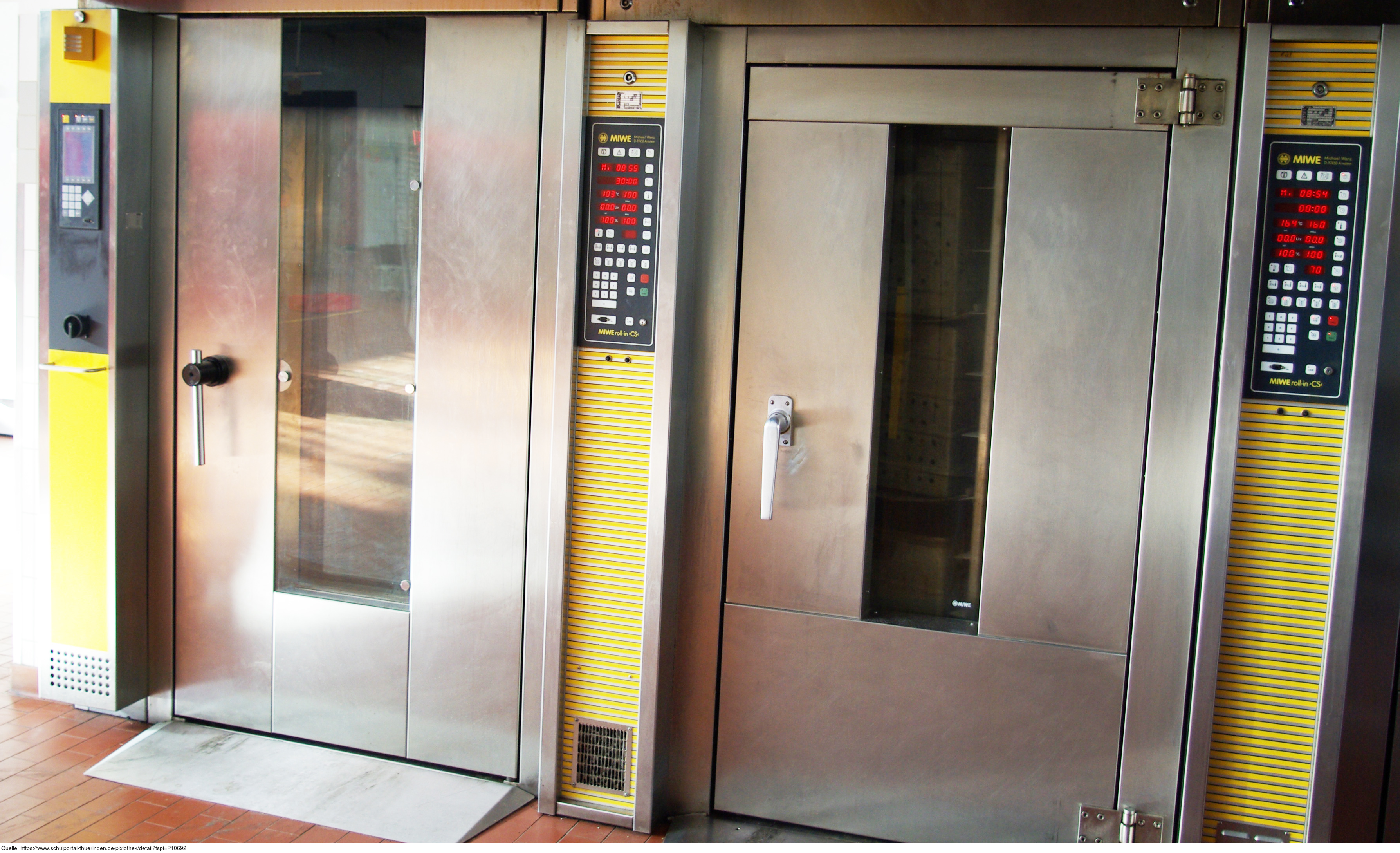 Das Bild zeigt Technik in einer Bäckerei. Zu sehen sind Bäckerei-Backöfen. In einem Stikkenofen können mit Hilfe eines Stikkenwagens Backbleche übereinander bequem be- und entladen werden. Stikkenöfen arbeiten mit Umwälzung von heißer Luft (Konvektion). Das Bild ist unter CC0 lizenziert und kann somit frei verwendet werden.