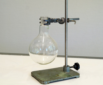 Das Foto gehört zur Serie "Experimente Chemie". Es zeigt den Aufbau eines Experiments mit Stativfuß, Stativklemme und Einhals-Rundkolben. Das Bild ist unter CC0 lizenziert und kann somit frei verwendet werden.