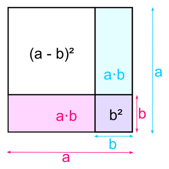 Das Bild gehört zur Serie "Mathematik Algebra". Es zeigt eine geometrische Veranschaulichung der zweiten Binomischen Formel. Das gesamte Quadrat hat die Seitenlänge a und damit den Flächeninhalt a². Soll daraus ein Quadrat der Seitenlänge (a − b) erzeugt werden, wird zuerst die waagerecht liegende, rot gefärbte Rechteckfläche a ⋅ b abgezogen. Danach wird die ebenso große türkisgefärbte Rechteckfläche rechts abgezogen. Dabei hat man aber das kleine Quadrat b² wegen der Überlappung der Rechtecke doppelt abgezogen. Man muss also b² zur Korrektur noch einmal addieren.