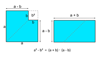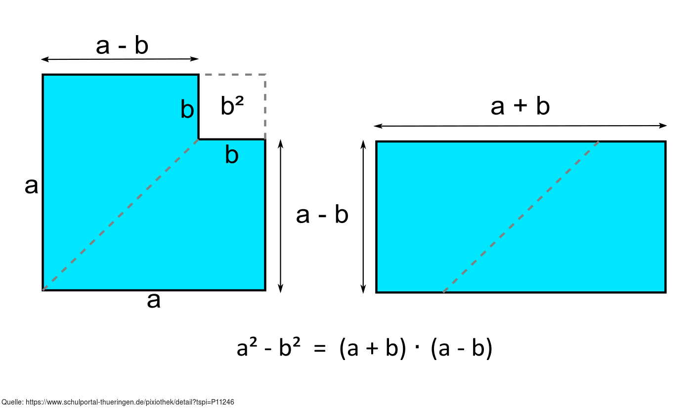Das Bild gehört zur Serie "Mathematik Algebra". Es zeigt eine geometrische Veranschaulichung der dritten Binomischen Formel. Das gesamte Quadrat links hat die Seitenlänge a und damit den Flächeninhalt a². Darauf liegt in der Ecke oben rechts ein kleineres Quadrat mit dem Flächeninhalt b². Die blaue Fläche ist die Differenz der beiden Quadratflächen und hat den Flächeninhalt a² - b². Durch einen Schnitt entlang der gestrichelten Linie entstehen zwei blaue Trapeze, die rechts daneben aneinandergelegt ein Rechteck der Länge (a + b) und der Breite (a - b) bilden. Das veranschaulicht grafisch, dass a² - b² = (a + b)⋅(a - b) ist.