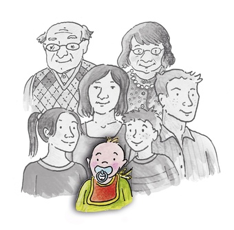Das Bild gehört zur Serie "Familienmitglieder als Zeichnung". Es zeigt ein gezeichnetes Baby im Kreise seiner Familie. Es gelten die Nutzungsbedingungen der Mediothek und Pixiothek.