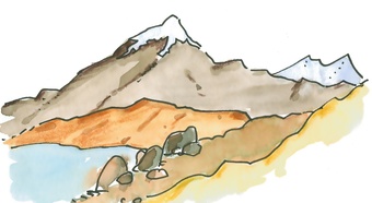 Das Bild zeigt eine gezeichnete Landschaft mit See und Bergen. Es gelten die Nutzungsbedingungen der Mediothek und Pixiothek.