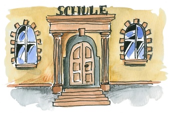 Das Bild gehört zur Serie "Unterricht". Es zeigt eine gezeichnete Schule (Eingang, Portal). Es gelten die Nutzungsbedingungen der Mediothek und Pixiothek.
