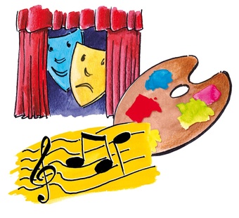 Das Bild gehört zur Serie "Schulfächer". Es zeigt ein gezeichnete Symbolbild für die Unterrichtsfächer Musik, Darstellen und Gestalten, Kunsterziehung. Es gelten die Nutzungsbedingungen der Mediothek und Pixiothek.