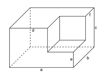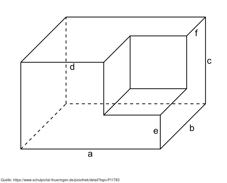 Das Bild gehört zur Serie "Geometrie Körper". Es zeigt einen Quader, bei dem an einer Ecke ein quaderförmiges Stück herausgetrennt wurde. Bei Vorgabe von Maßangaben für die bezeichneten Seiten kann das Volumen des Restkörpers berechnet werden. Das Bild ist unter CC0 lizenziert und kann somit frei verwendet werden.
