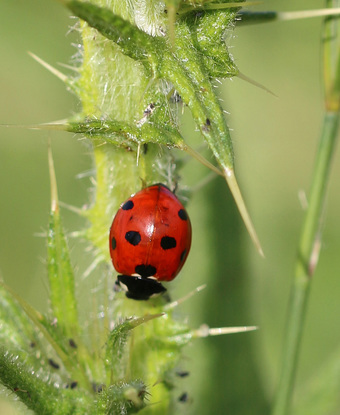 Das Foto hehört zur Serie "Käfer". Es zeigt einen Siebenpunkt-Marienkäfer oder Siebenpunkt (Coccinella septempunctata) aus der Familie der Marienkäfer. Es gelten die Nutzungsbedingungen der Mediothek und Pixiothek.