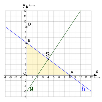 Das Bild gehört zur Serie "Mathematik, lineare Funktionen". Es zeigt im Koordinatensystem zwei lineare Funktionen g und h. Durch den Punkte C verläuft der zu h parallele Graph der Funktion f. Die Funktionsgleichungen sind zu ermitteln. Weiterhin können Koordinaten von Schnittpunkten und Nullstellen abgelesen werden. Für das eingezeichnete rechtwinklige Dreieck können Flächeninhalt und Umfang (unter Anwendung vom Pythagoras) berechnet werden. Das Bild ist unter CC0 lizenziert und kann somit frei verwendet werden.