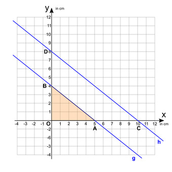 Das Bild gehört zur Serie "Mathematik, lineare Funktionen". Es zeigt im Koordinatensystem zwei lineare Funktionen g und h. Die Graphen von g und h sind zueinander parallel. Die Funktionsgleichungen sind zu ermitteln. Weiterhin können Koordinaten von Schnittpunkten und Nullstellen abgelesen werden. Für das eingezeichnete rechtwinklige Dreieck OAB können Flächeninhalt und Umfang (unter Anwendung vom Pythagoras) berechnet werden. Durch eine zentrische Streckung vom Punkt O aus mit Streckungsfaktor 2 entsteht das Dreieck OCD. Um wie viel Prozent (auf wie viel Prozent) vergrößern sich Umfang und Flächeninhalt des Dreiecks durch die Streckung? Das Bild ist unter CC0 lizenziert und kann somit frei verwendet werden.