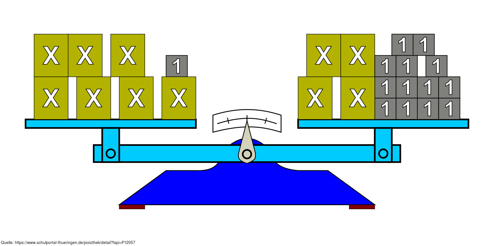 Das Bild gehört zur Serie "Mathematik, Gleichungen". Es veranschaulicht die Lösung einer linearen Gleichung durch Äquivalenzumformung mit dem Bild einer Waage. Zur Gleichung 21 veranschaulichen die Bilder 21-1 bis 21-4 die Umformungsschritte. Das Bild ist unter CC0 lizenziert und kann somit frei verwendet werden.