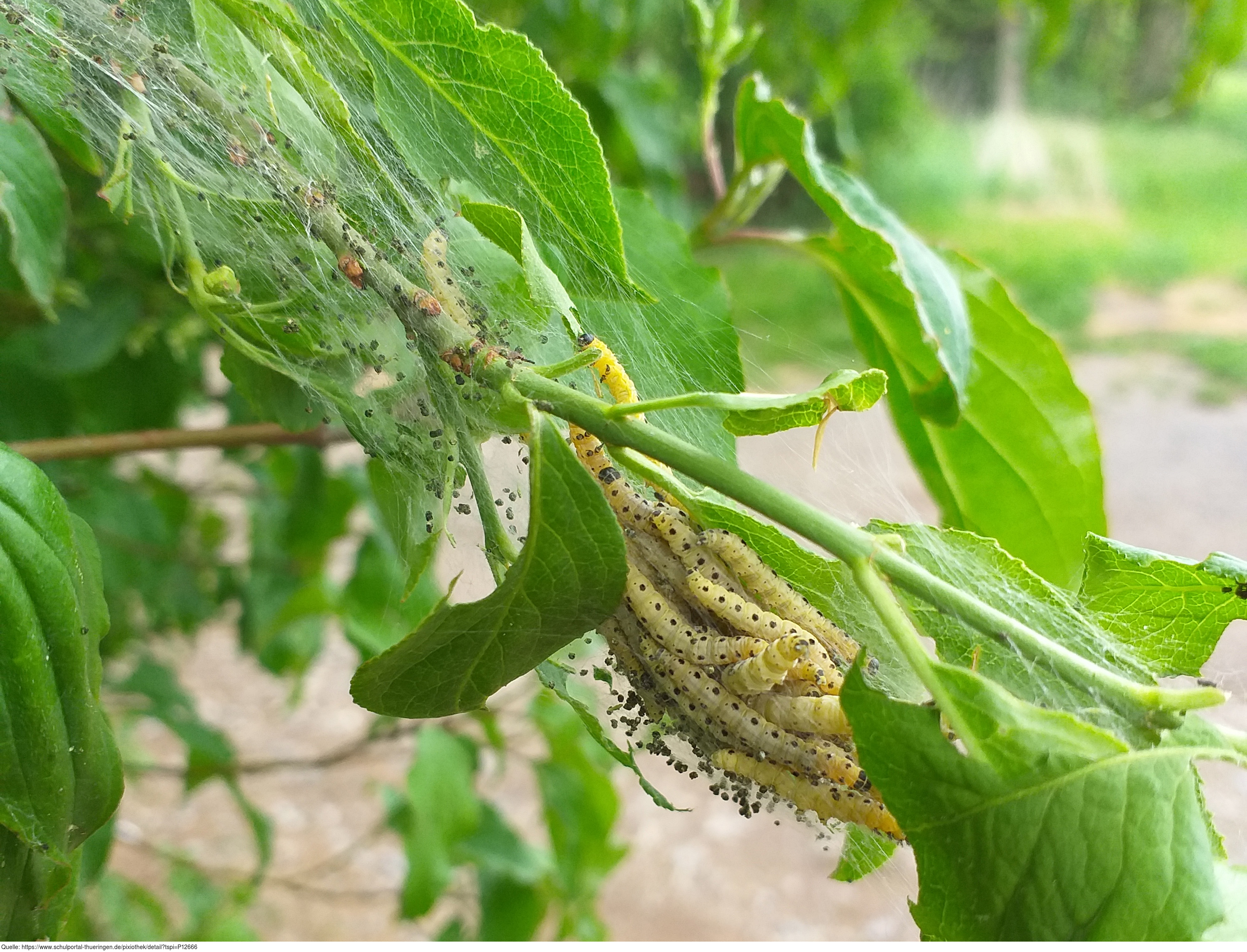 Das Bild gehört zur Serie "Schmetterlinge". Es zeigt Raupen der Gespinstmotte. Diese bilden im Mai und Juni auffällige Gespinste zwischen kahlgefressenen Zweigen. In den durch schwarze Kotkrümel verschmutzten Gespinsten leben oft große Mengen der Larven. Es gelten die Nutzungsbedingungen der Mediothek und Pixiothek.