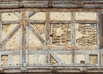 Das Foto gehört zur Serie "Fachwerkhäuser". Es zeigt Gefache mit Astgeflecht und Lehmausfachung eines sanierungswürdigen Fachwerkhauses. Es gelten die Nutzungsbedingungen der Mediothek und Pixiothek.