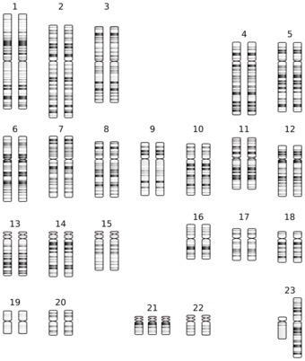 Karyogramm eines Mannes mit Down-Syndrom / Trisomie 21. Es gelten die Nutzungsbedingungen der Mediothek und Pixiothek. Auf http://unterricht.petzinger.net/biochdropbox.html auch als svg und in CC-BY verfügbar.