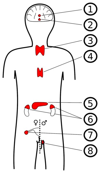 (1) Epiphyse / Zirbeldrüse (2) Hypophyse (3) Schilddrüse (4) Thymus (5) Bauchspeicheldrüse (6) Nebennieren (7) Eierstöcke (8) Hoden.