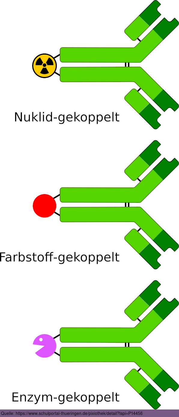 verschiedene (chemische) Modifikationen an Immunglobulinen zum Einsatz in der Molekularbiologie. Es gelten die Nutzungsbedingungen der Mediothek und Pixiothek. Auf http://unterricht.petzinger.net/biochdropbox.html auch als svg und in CC-BY verfügbar.