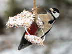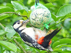 Buntspecht, Altvogel füttert Jungvogel