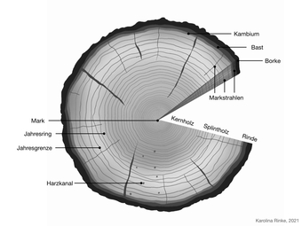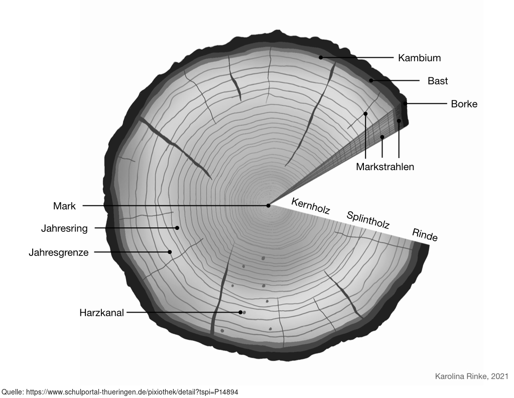 Die Grafik gehört zur Serie "Holz". Das Bild zeigt den Querschnitt eines Baumstammes, s/w, mit Beschriftung. Es gelten die Nutzungsbedingungen der Mediothek und Pixiothek.