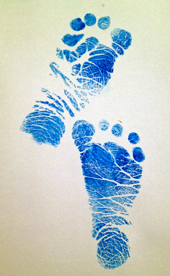 Das Bild zeigt einen mit Farbe erstellten ersten Fußabdruck eines Babys, so wie er häufig von den Eltern für Bilder und Alben angefertigt wird. Es gelten die Nutzungsbedingungen der Mediothek und Pixiothek.