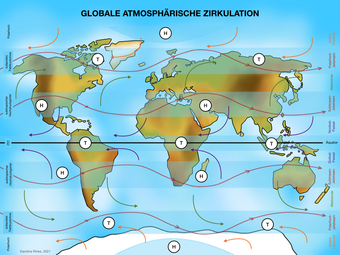 Das Bild gehört zur Serie „Zirkulationssysteme der Erde“. Es verdeutlicht die globale atmosphärische Zirkulation der Erde. Bild-Variante: farbig; teilbeschriftet. Es gelten die Nutzungsbedingungen der Mediothek und Pixiothek.