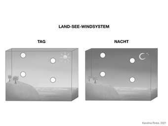 Das Bild gehört zur Serie „Zirkulationssysteme der Erde“. Es verdeutlicht das Land-See-Windsystem der Erde. Bild-Variante: s/w; unbeschriftet. Es gelten die Nutzungsbedingungen der Mediothek und Pixiothek.