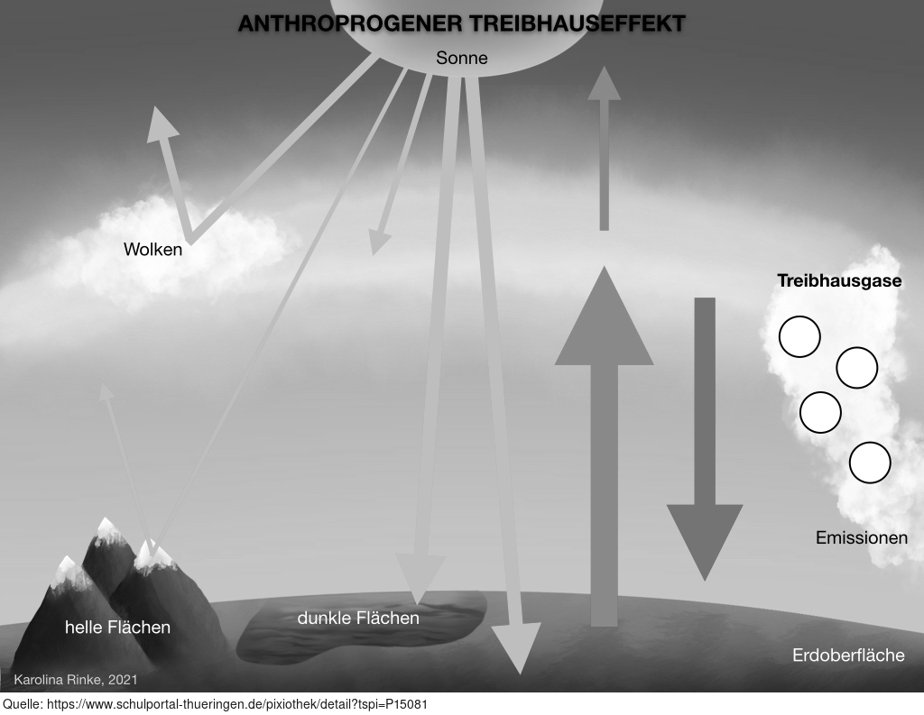 Das Bild verdeutlicht den anthropogenen Treibhauseffekt. Bild-Variante: s/w; teilbeschriftet. Es gelten die Nutzungsbedingungen der Mediothek und Pixiothek.