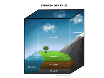 Das Bild verdeutlicht die Sphären der Erde (Hüllenaufbau). Bild-Variante: farbig; beschriftet. Es gelten die Nutzungsbedingungen der Mediothek und Pixiothek.