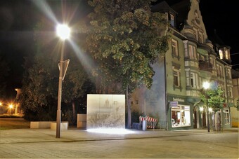 Motiv eines Stadtrundganges durch Pößneck (Ostthüringen) bei Nacht. Standort: Straße des Friedens, Einfahrt Breite Straße. Es gelten die Nutzungsbedingungen der Mediothek und Pixiothek.