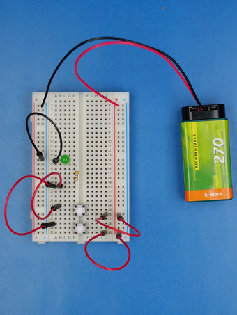 Die Schaltung realisiert eine logische ODER-Verknüpfung der Zustände der beiden Taster. Sobald einer der beiden Taster gedrückt wird, leuchtet die LED - auch wenn beide Taster gleichzeitig gedrückt werden. Es gelten die Nutzungsbedingungen der Mediothek und Pixiothek.