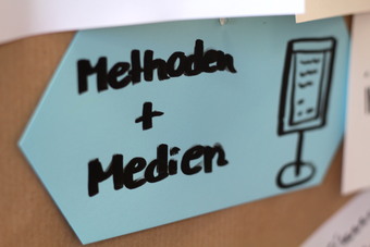 Das Bild zeigt eine Moderationskarte mit der Aufschrift "Methoden + Medien", fotografiert von Elisabeth Scherer für SeLL, HHU Düsseldorf. Es gelten die Nutzungsbedingungen der Mediothek und Pixiothek.
