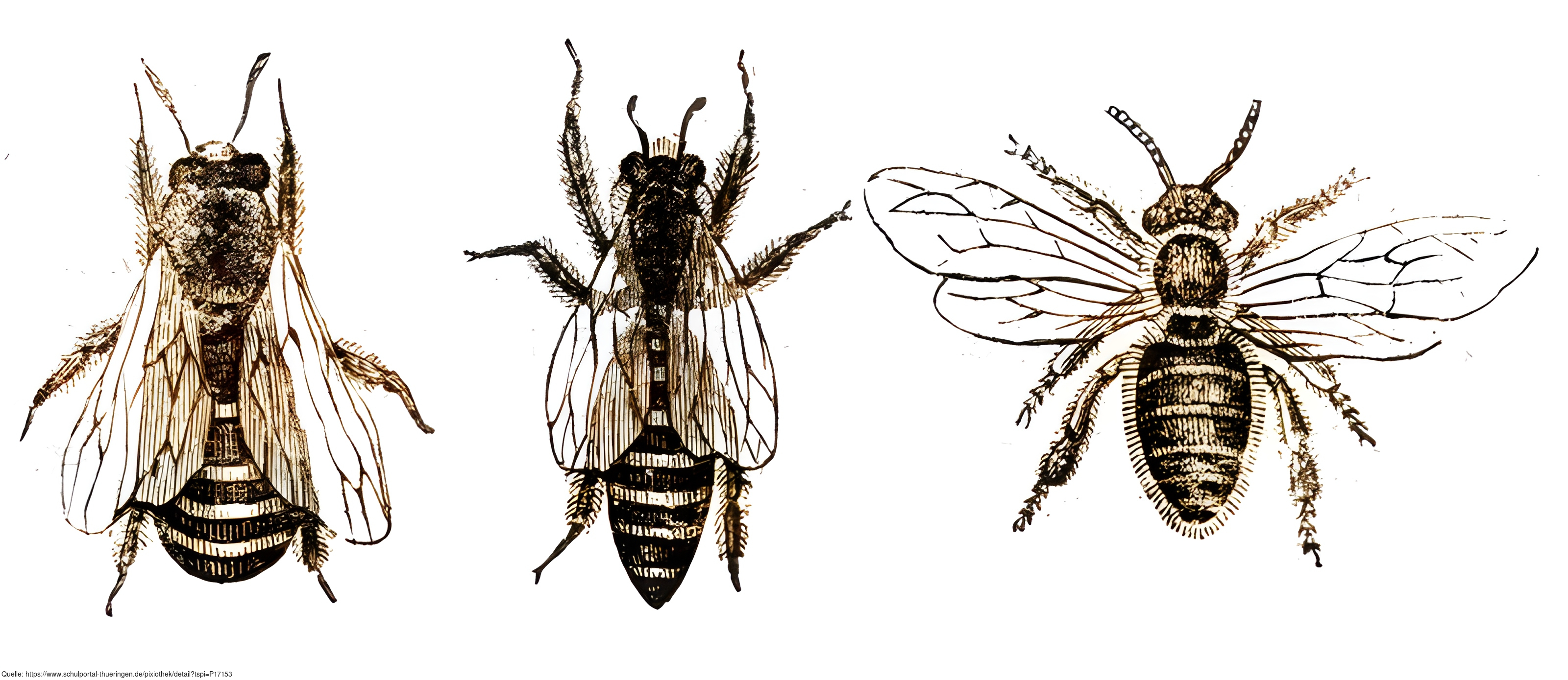 Abgebildet sind eine Drohne, eine Bienenkönigin und eine Arbeitsbiene. Das Bild ist gemeinfrei und kann somit frei verwendet werden. Die Abbildung stammt aus dem Werk "Klaus, der Bienenvater aus Böhmen" (1857) von Johann Nepomuk . Quelle (gemeinfreies Digitalisat): http://publikationen.ub.uni-frankfurt.de/frontdoor/index/index/year/2006/docId/15886 (erstes Hauptstück, Seite 27)