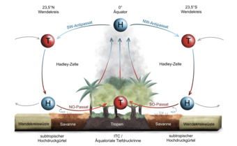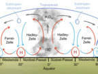 Das Bild gehört zur Serie „Windsysteme“. Es verdeutlicht aus der Querschnittsperspektive die Windzirkulation vom Äquator bis zu den Wendekreisen. Variante: farbig; beschriftet. Es gelten die Nutzungsbedingungen der Mediothek und Pixiothek.