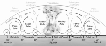 Das Bild gehört zur Serie „Windsysteme“. Es gibt aus der Querschnittsperspektive einen Überblick über die globale Windzirkulation. Variante: s/w; beschriftet. Es gelten die Nutzungsbedingungen der Mediothek und Pixiothek.