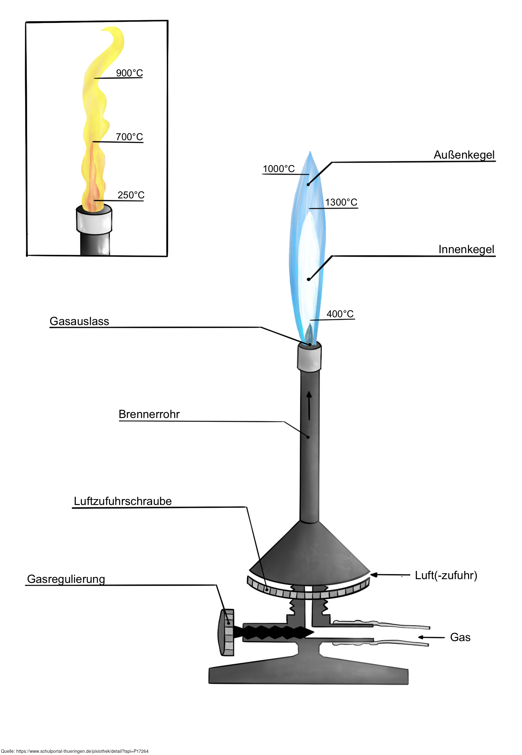 Das Bild verdeutlicht den Aufbau eines Bunsenbrenners. Variante: zwei Flammen, farbig; unbeschriftet. Es gelten die Nutzungsbedingungen der Mediothek und Pixiothek.