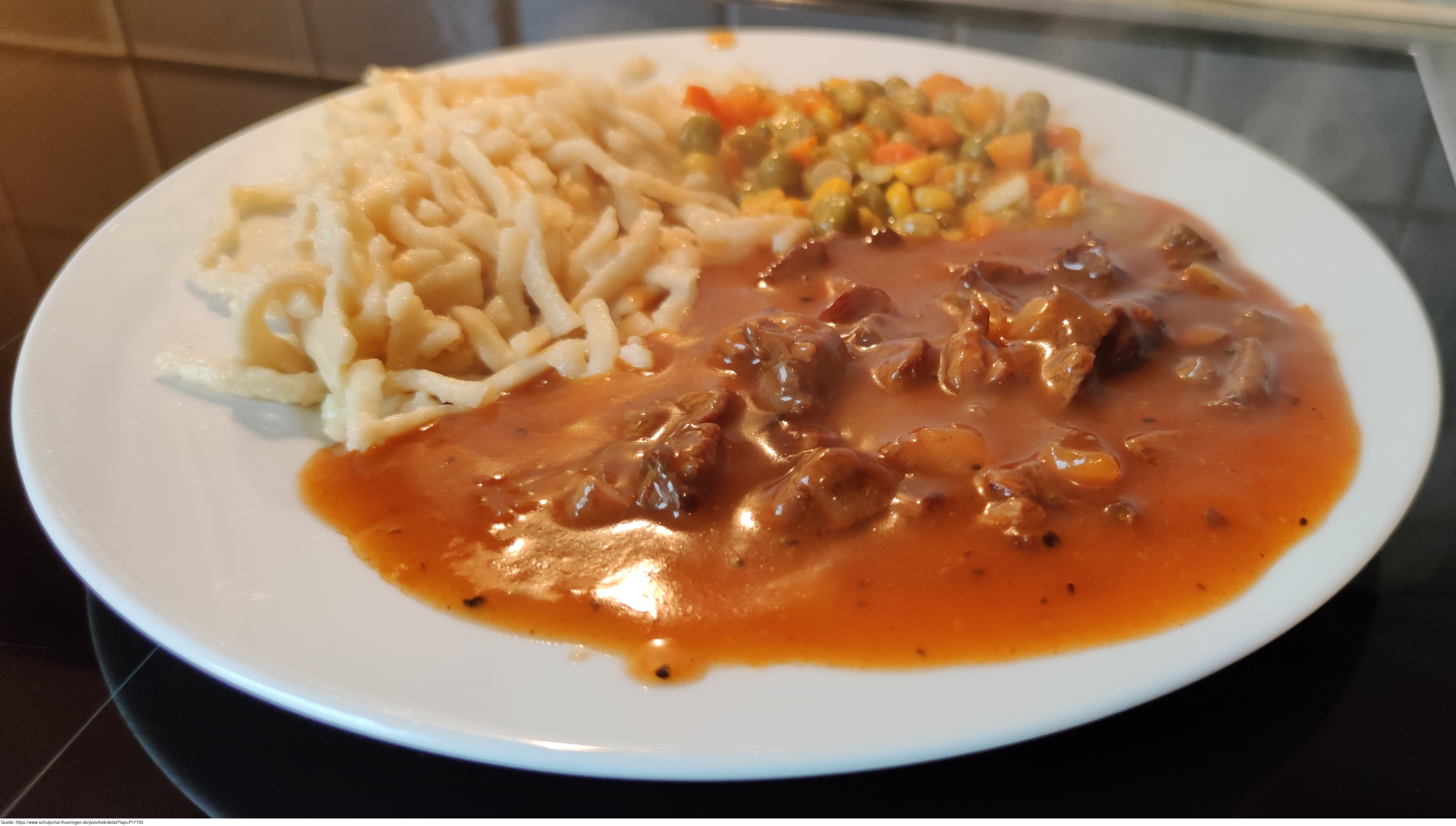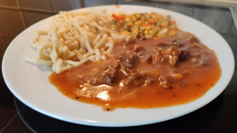 Das Bild zeigt ein Tellergericht mit Nudeln bzw. Spätzle, Mischgemüse, Gulasch und Tomatensoße.. Es gelten die Nutzungsbedingungen der Mediothek und Pixiothek.