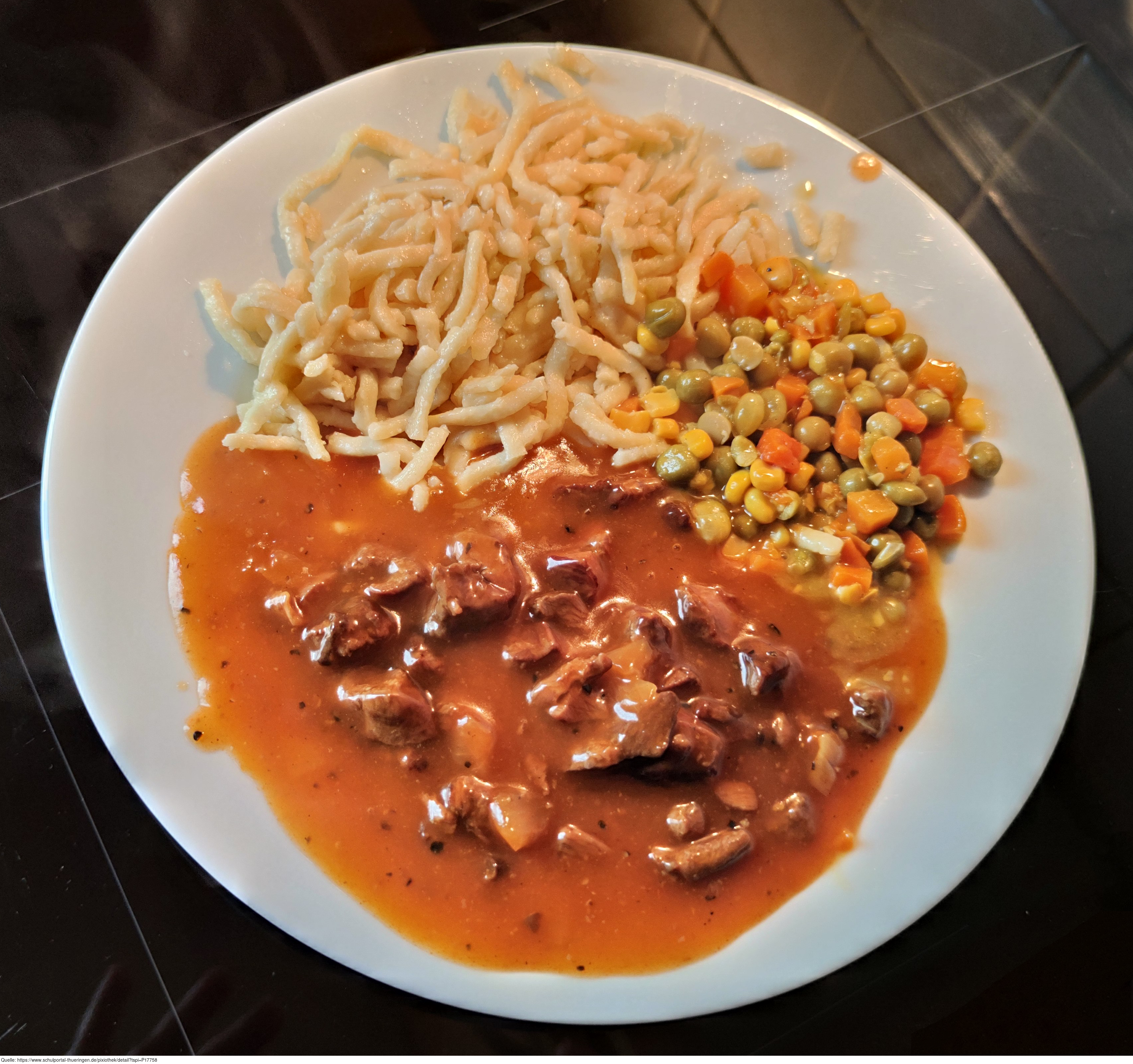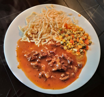 Das Bild zeigt ein Tellergericht mit Nudeln bzw. Spätzle, Mischgemüse, Gulasch und Tomatensoße.. Es gelten die Nutzungsbedingungen der Mediothek und Pixiothek.