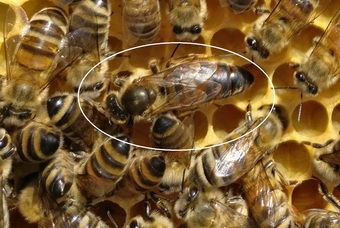 Bienenkönigin umringt von Arbeiterinnen