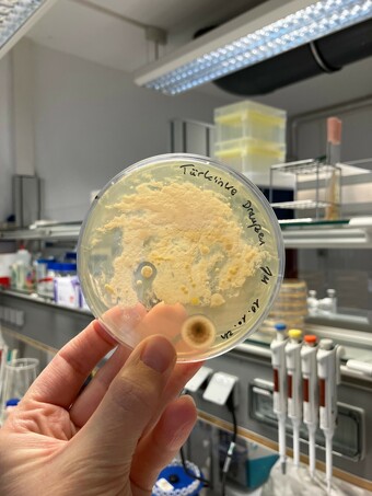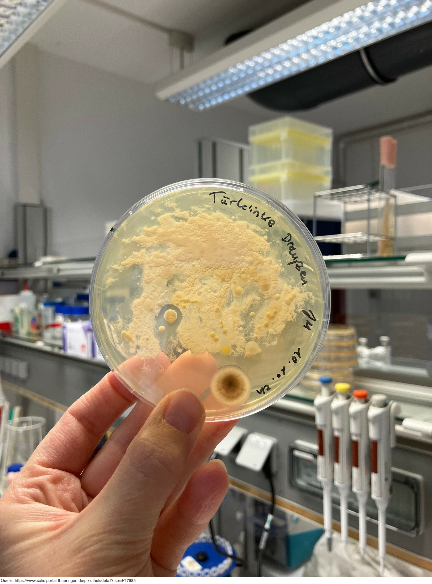 Das Bild zeigt einen Abklatsch-Test einer Türklinke in einem öffentlichen Gebäude mittels Abklatschplatte bzw. Fangplatte. Entstanden ist das Bild im Zuge der Ausbildung zum Biologielaboranten/ zur Biologielaborantin an der Uni Jena. Es gelten die Nutzungsbedingungen der Mediothek und Pixiothek.