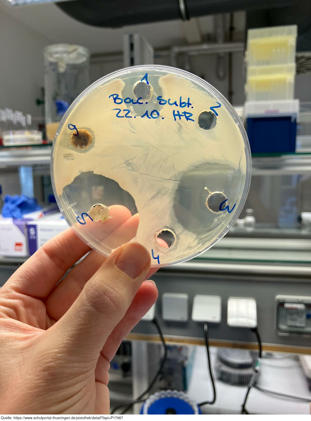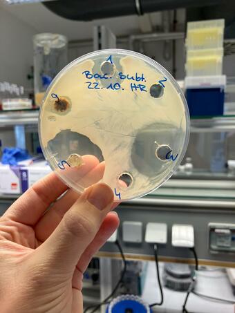 Das Bild zeigt eine Agarplatte, die mit einer Bakterienkultur bestrichen wurde. In den Bereichen 1 - 6 befinden sich Antibiotika, Ingwer und Knoblauch (zum Beispiel 1 - Ampicillin, 3 - Steptomycin, 5 - Knoblauch, 6 - Ingwer). Der sogenannte Hemmhof (Kreis um den betreffenden Bereich) ist bei Knoblauch am größten, was dessen antibakterielle Wirkung verdeutlicht. Entstanden ist das Bild im Zuge der Ausbildung zum Biologielaboranten/ zur Biologielaborantin an der Uni Jena. Es gelten die Nutzungsbedingungen der Mediothek und Pixiothek.