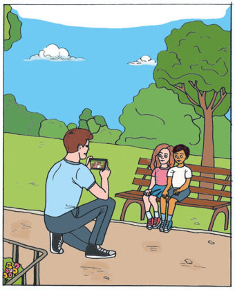 Das Bild zeigt einen Vater, der seine beiden Kinder mit einem Handy fotografiert. Das Bild kann als Teil einer Bildergeschichte verwendet werden - siehe Funktionslink "Weitere Bilder der Serie". Es gelten die Nutzungsbedingungen der Mediothek und Pixiothek.