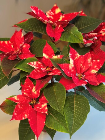 Das Foto gehört zur Serie "Weihnacht". Das Bild zeigt die rot-weißen Hochblätter der Pflanze Euphorbia pulcherrima, bekannt als Weihnachts-, Advents,- oder Christstern. Sie gehört zur Familie der Wolfsmilchgewächse.