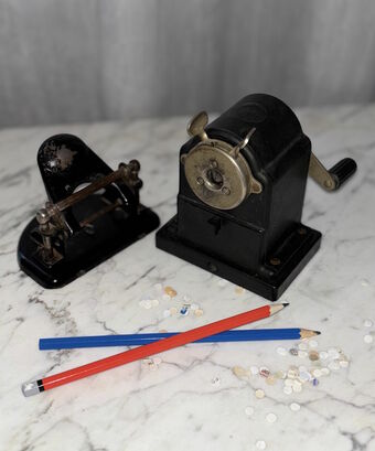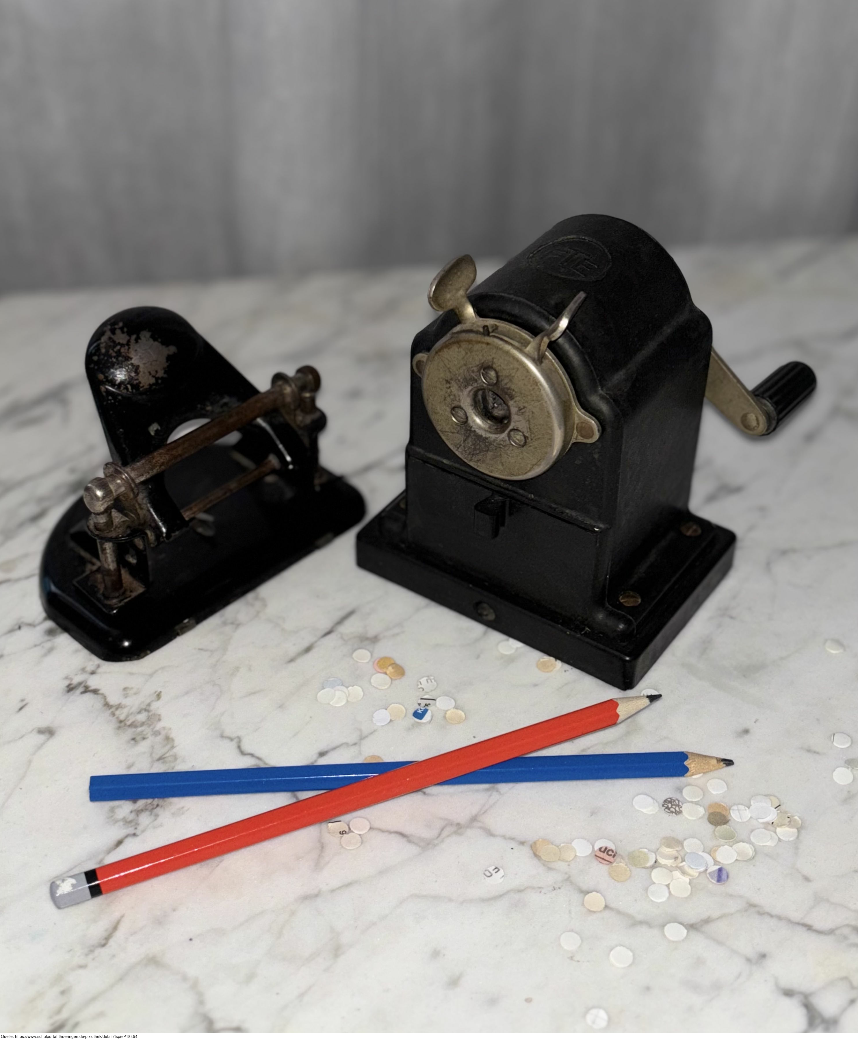 Das Foto zeigt einen historischen Locher und einen historischen Bleistiftspitzer.