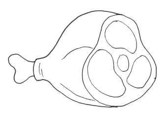 Das Bild zeigt ein gezeichnetes Stück Fleisch am Knochen (s/w). Es gehört zur Serie "Ernährungspyramide zum Basteln und Gestalten" und findet u.a. im gleichnamigen Lernobjekt unter https://www.schulportal-thueringen.de/web/guest/media/detail?tspi=18517 Verwendung. Es gelten die Nutzungsbedingungen der Mediothek und Pixiothek.
