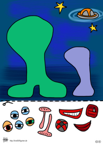 Das Bild zeigt ein Weltallmotiv mit Alien (farbig) und kann als Schnipselbildvorlage für Kinder im Kindergarten bzw. Elementarbereich dienen. Das Bild ist unter CC0 lizenziert und kann somit frei verwendet werden. Es ist neben weiteren Bildern auch hier zu finden: https://kindoergarten.wordpress.com/