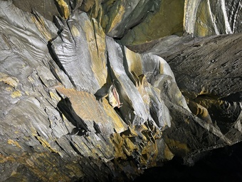 Das Bild zeigt ein Großes Mausohr (Fledermausart) in einem Schieferstollen. Es gelten die Nutzungsbedingungen der Mediothek und Pixiothek.